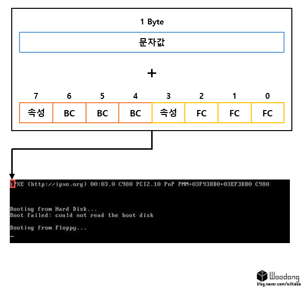 위에 FC는 전경색, BC는 배경색이다. 그리고 상/하위 비트에 각각 속성이 하나씩 있다.