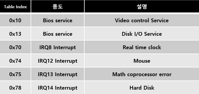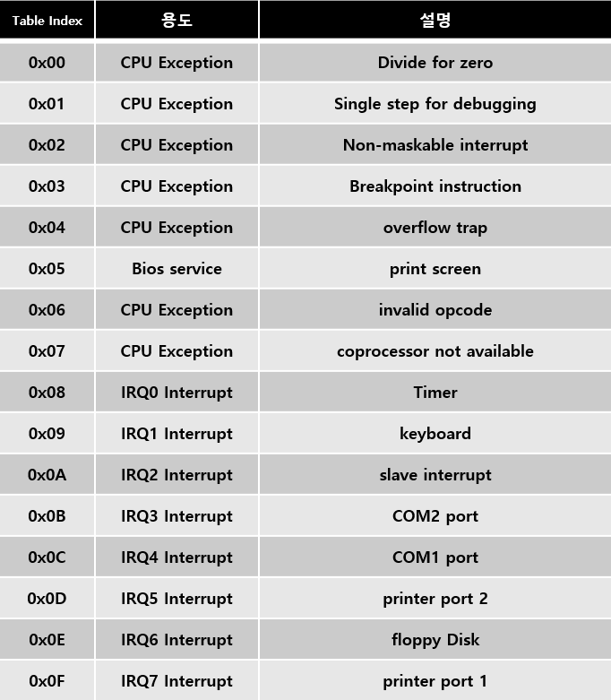 테이블의 각 항목들은 인덱스에 해당하는 인터럽트가 발생했을 시에 처리하는 핸들러 주소가 담겨있고, 리얼모드에서 각 항목은 4바이트 크기를 갖는다. 최대 256개의 인터럽트를 설정할 수 있다. 테이블에서 주요한 항목들을 한번 보자.