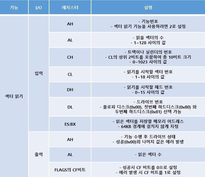 이 때 레지스터를 이용하여 파라미터를 넘겨 준다. AX, BX, CX, DX 레지스터와 ES 세그먼트 레지스터를 사용하여 파라미터를 넘겨주며