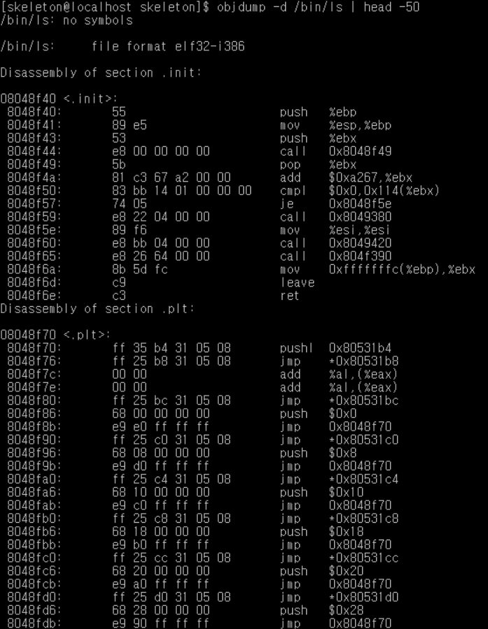 보통은 오브젝트 파일 형식이 elf32-i386 이므로 섹션별로 구분지어서 덤프하야 출력된다.