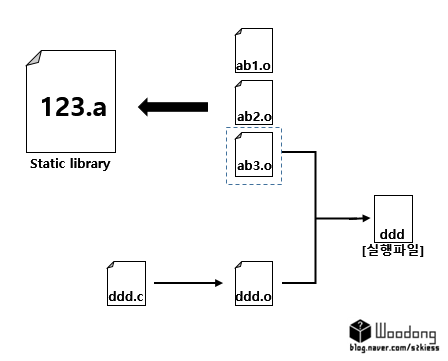 (ar 명령으로 여러개의 오브젝트 파일을 하나의 .a 파일로 합칠 수 있다.)