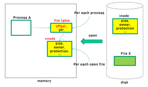 file table 은 프로세스 마다 할당되는 것이고, offset 값과 v-node와 연결하는 포인터가 존재한다.