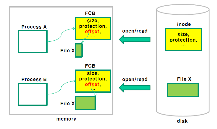 offset을 제외한 다른 값들을 모두 같은 FCB로 공유를 하는 것이다.