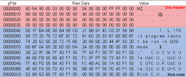 PE분석할 때 눈여겨 볼 부분은 아니지만 이 코드를 시작으로 PE 포맷이 시작된다는 걸 알아야 한다.