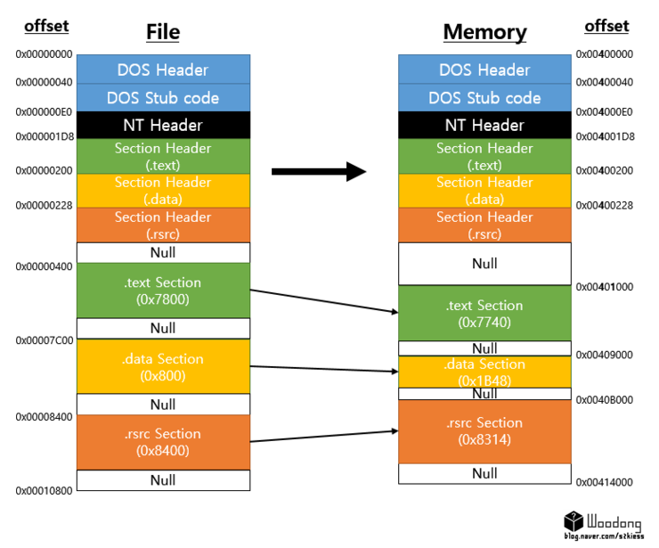 파일 상태일 때의 PE와 메모리 상에 올라갔을 때의 PE이다.