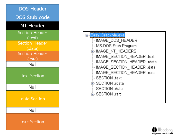 그림 1은 PE파일 포맷의 기본 레이아웃과 PE View 라는 툴로 임의의 exe파일을 열어 네비게이터를