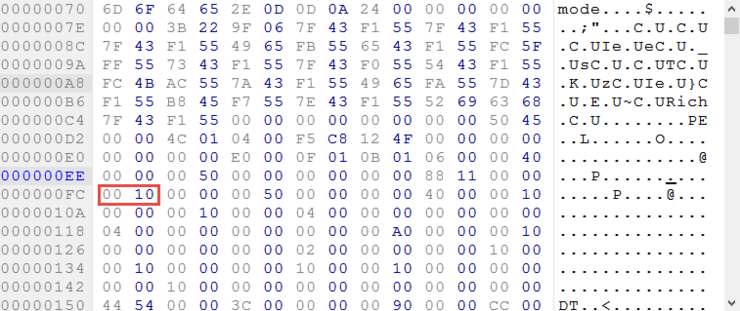 위 그림 처럼 FileAlignment 값이 0x1000 이고, 해당 섹션의 데이터 크기가 0x1400 이라면