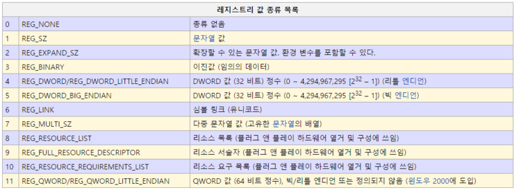 레지스트리 값에는 11가지 종류가 있다. 가장 자주보이는게 REG_DWORD, REG_SZ인데,