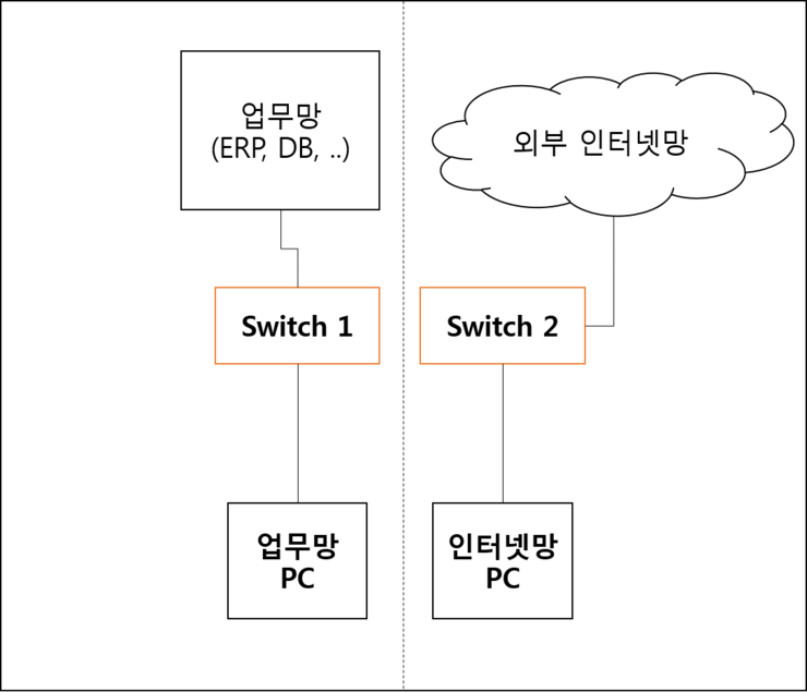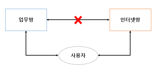 위 그림처럼 업무망 pc와 인터넷망 pc를 따로 사용힌다.