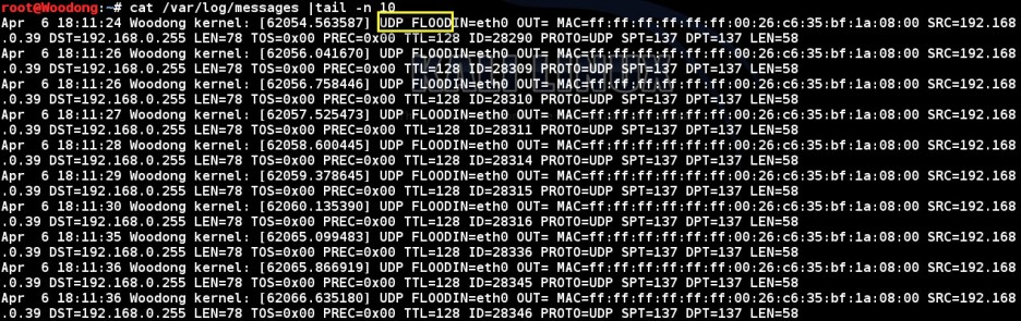 로그 헤더에 보면 아까 정책 추가할 때 적용시켰던 "UDP FLOOD" 문구가 보임으로