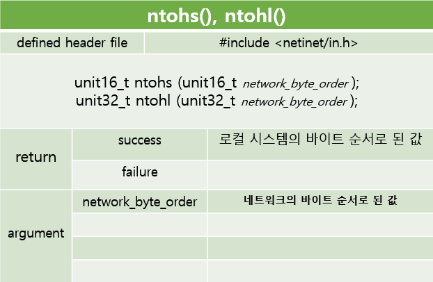 network(n) 에서(to) host(h) 로 변환하는 함수들이다. ntohs, ntohl