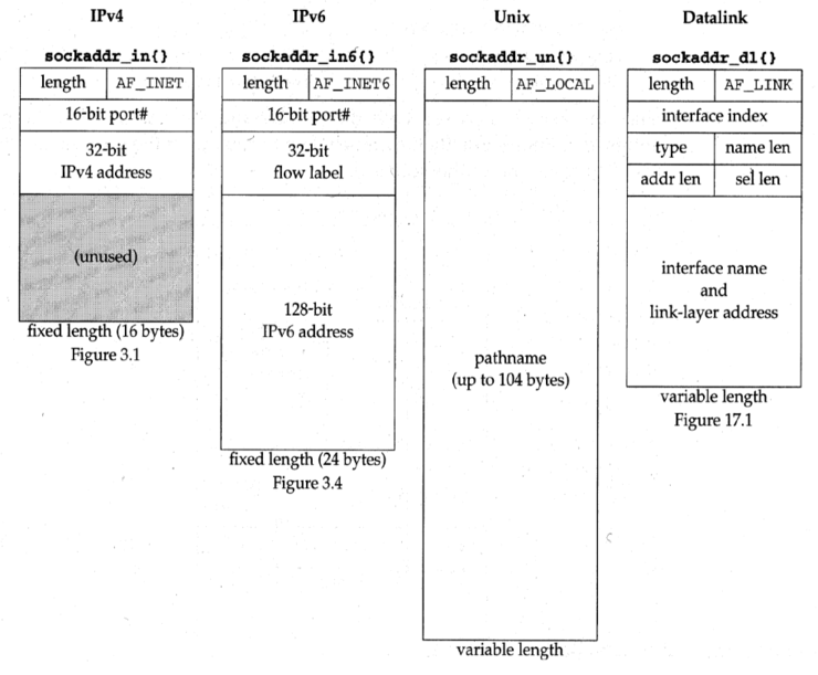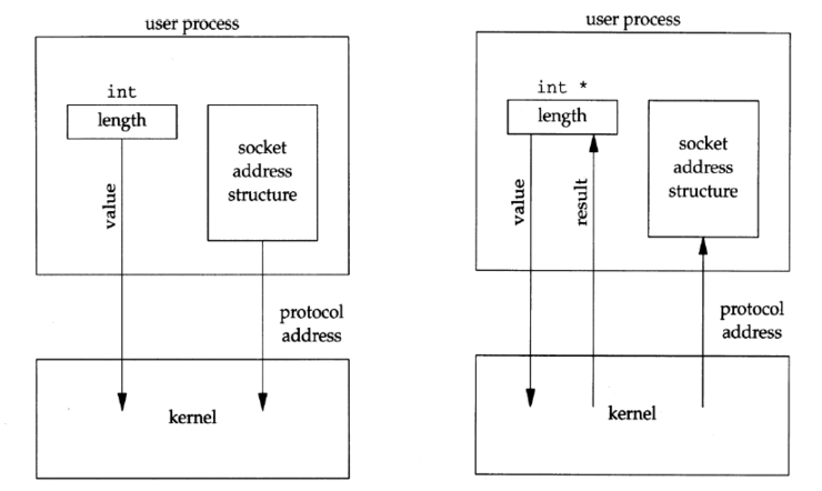 이런 값-결과 인수를 사용하는 경우는 소켓 주소 구조의 길이가 일정한 IPv4(sockaddr_in = 16), IPv6(sockaddr_in6 = 24)은 관련없는데 유닉스 영역의 주소 구조(sockaddr_un) 같은 경우 크기가 고정적이지 않아 값-결과 인수가 필요하다.
