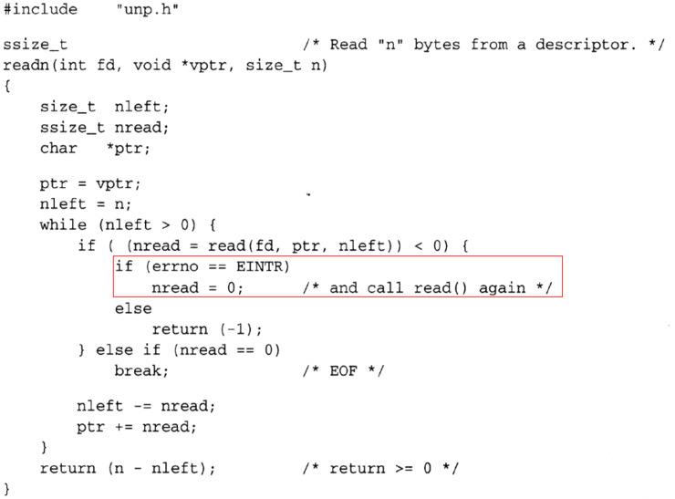 EINTR 시그널 즉, 인터럽트가 걸리면, 상위 if문으로 돌아가 read를 처음부터 다시 실행한다.