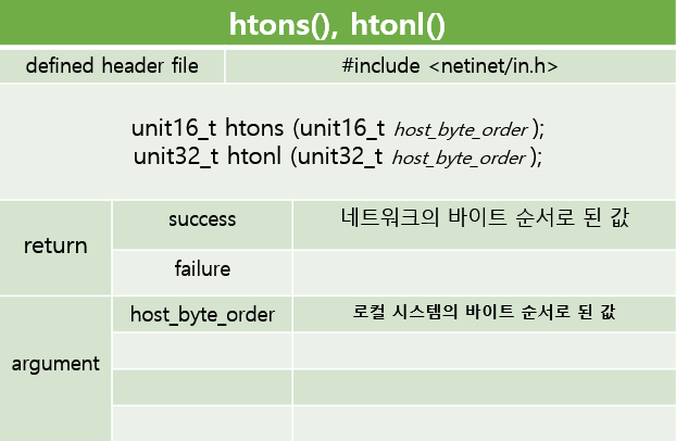 host(h) 에서(to) network(n)로 변환하는 함수들이다. htons, htonl 두가지인데,
