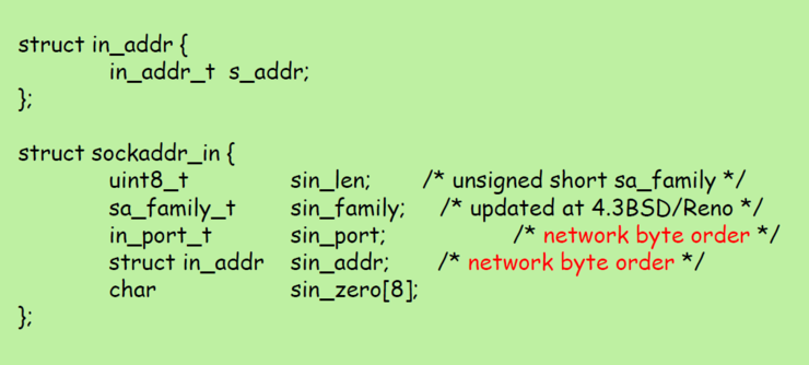 보통 이 구조체들의 이름은 sockaddr_ 로 시작하여 사용하는 프로토콜에 따른 접미사로 끝난다.
