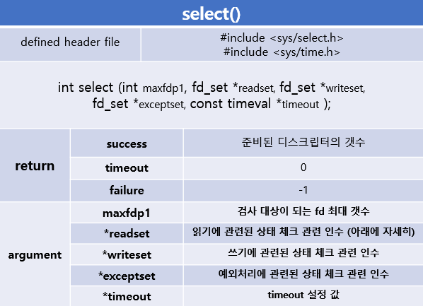 커널에게 관심있는 파일 디스크립터가 어떤 것이고, 얼마나 기다려야 하는지 알려주는 함수이다.