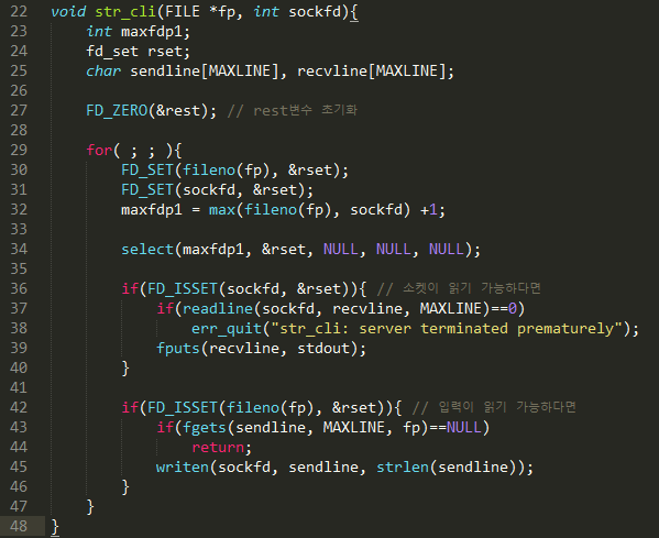 그 다음, FD_ISSET 메크로 함수를 이용하여 해당 디스크립터에 비트1로 셋팅된 부분이 있으면 if문 안으로 드가고