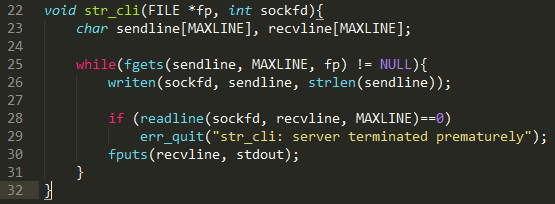 밑에도 마찬가지로 표준입력에 대한 체크를 하고 fgets를 이용하여 읽고, writen으로 소켓에 쓴다.