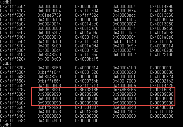 이제 NOP sled 중 하나에 리턴 어드레스를 주면 셸이 올라오지 않을까 싶은데. 해봅시다.